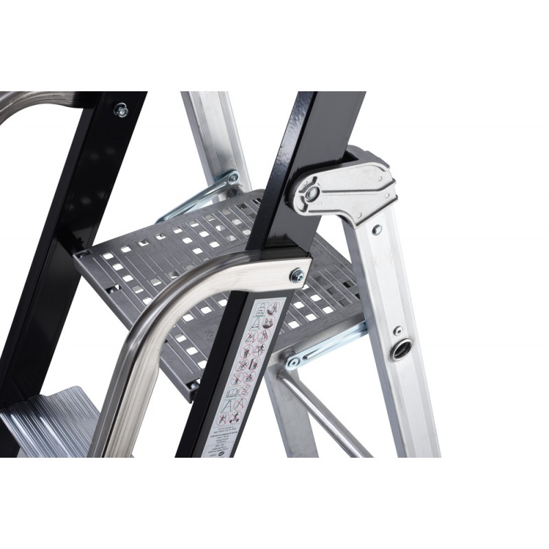 La scala doppia professionale GierrePro +AL754 ha la piattaforma (260x260 mm) in alluminio, si blocca in sicurezza con la sola pressione della mano.